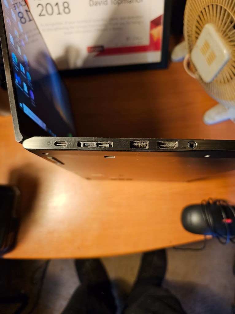 As for ports, on the left side is from left to right: USB-C 4.0, USB-C 3.2, Full size HDMI 2.0b, USB-A 3.2, and 1x Audio (headphone and microphone combo jack)